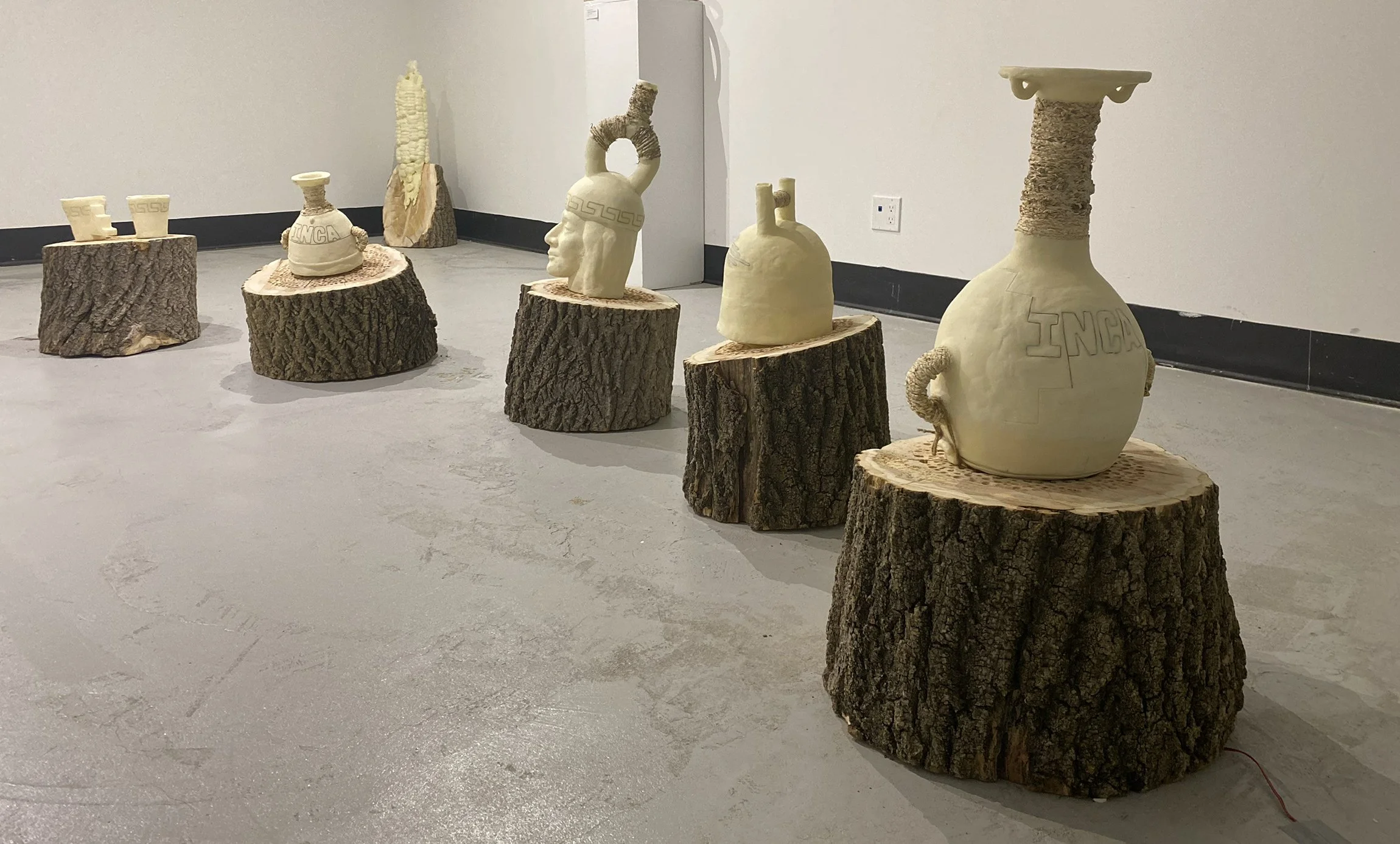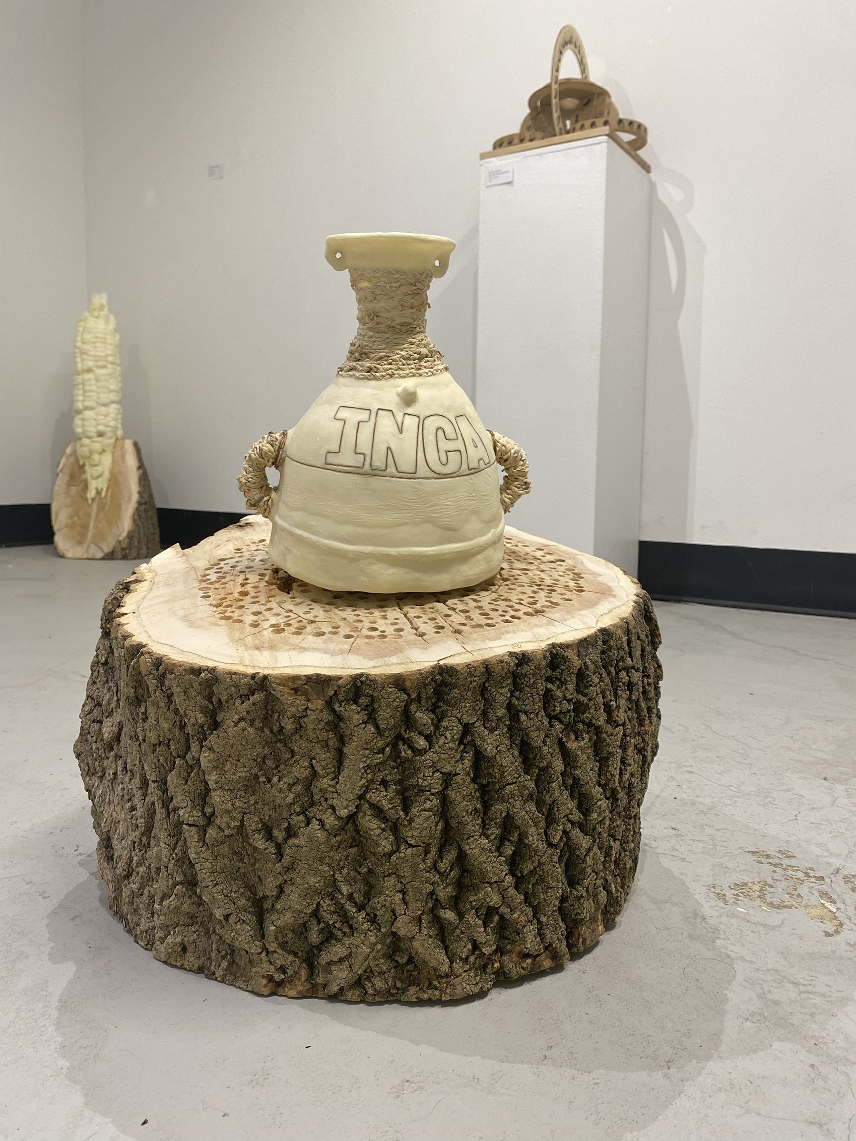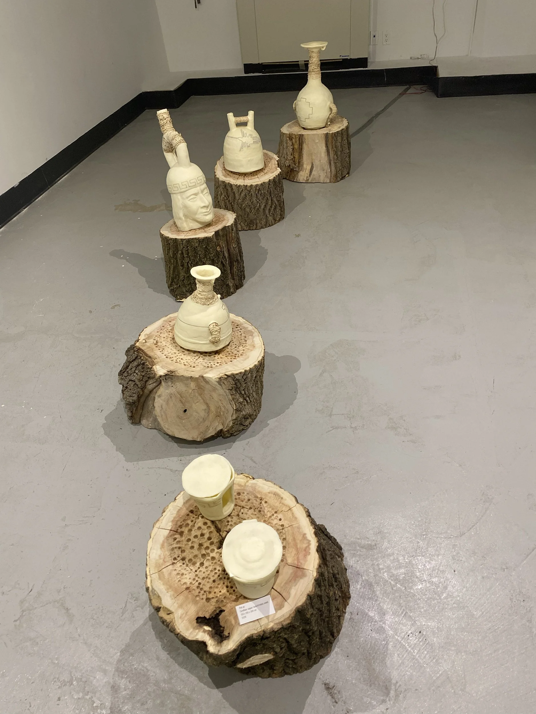 It is a multimedia work consisting of 5 wood logs (Juglans Nigra wood trunk) in their original state that support the six containers made of corn flour, husk of maize and copper wire. Informed by Pre-Columbian culture, this installation is an interactive piece that looks for a connection with the viewer through direct participation, in which the dialogue and relational moments make the piece complete.