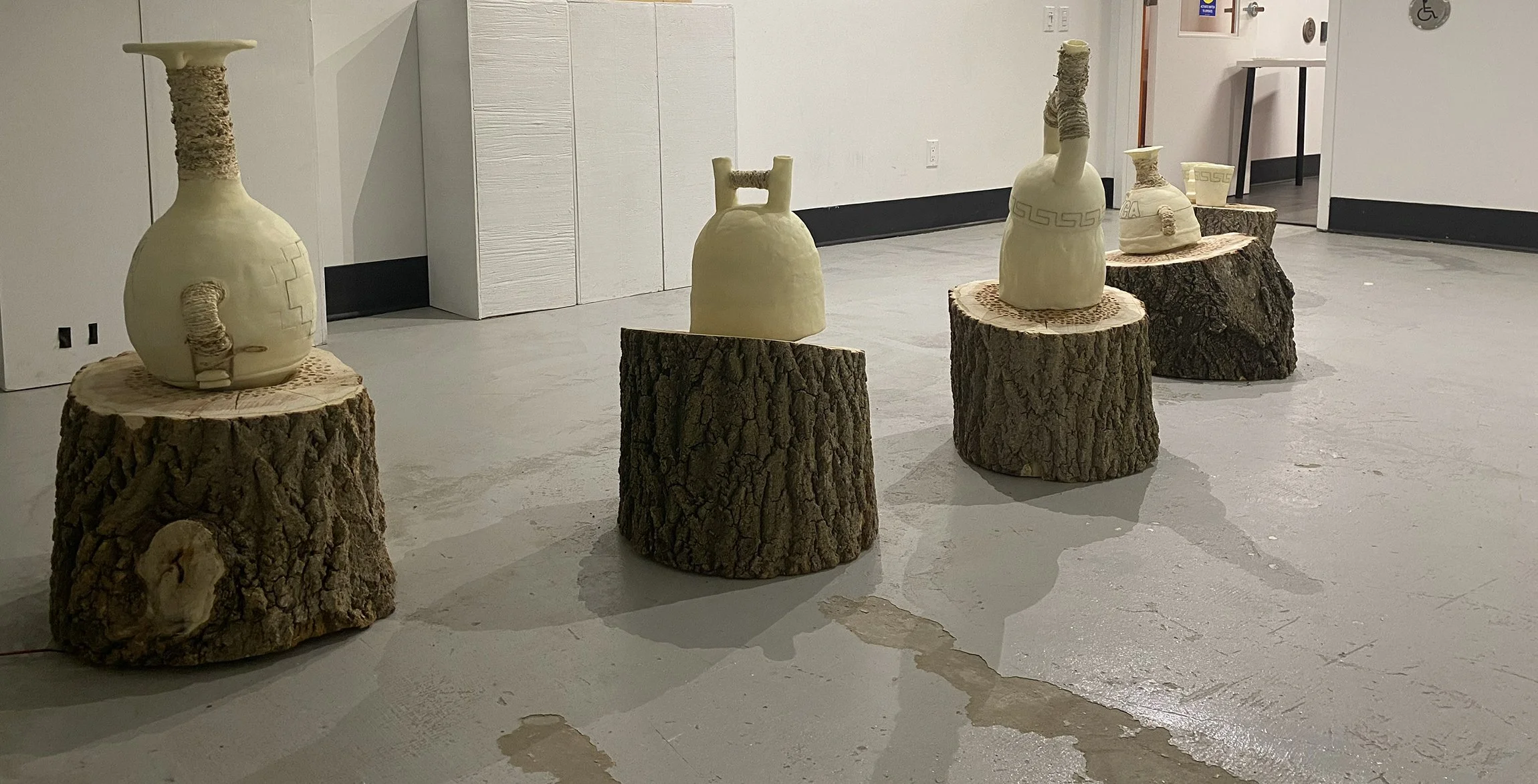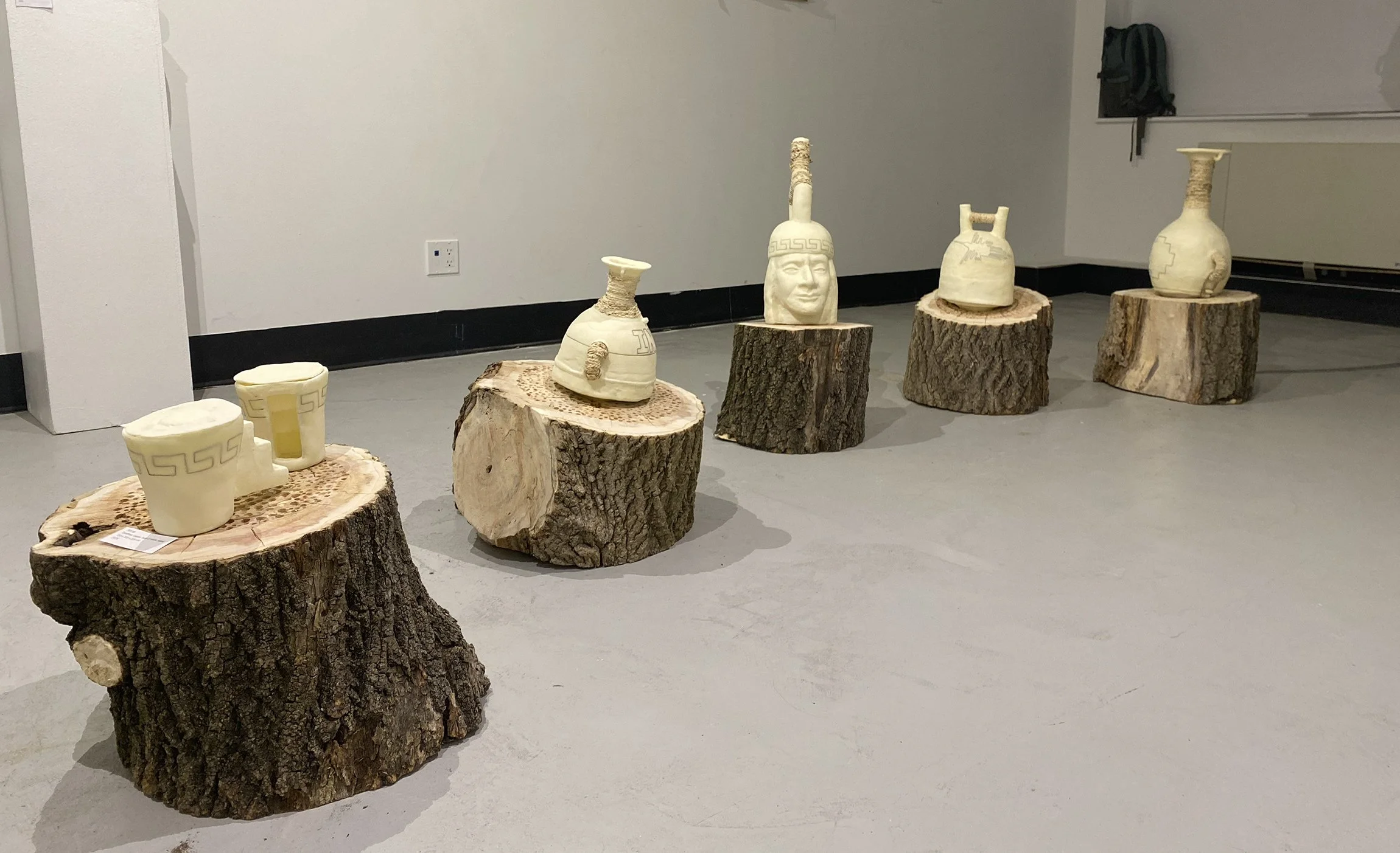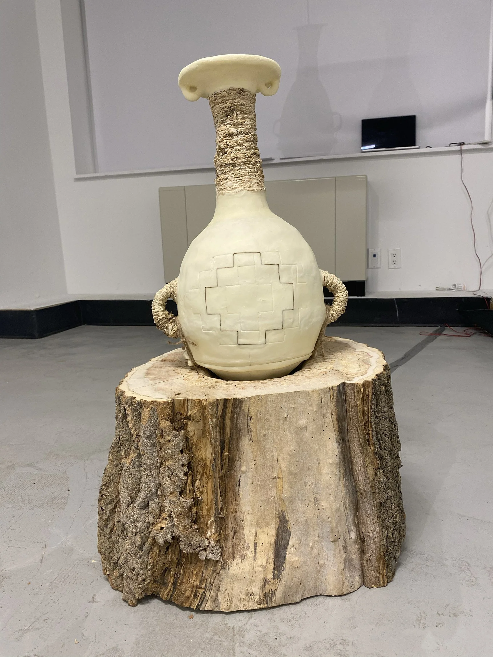 It is a multimedia work consisting of 5 wood logs (Juglans Nigra wood trunk) in their original state that support the six containers made of corn flour, husk of maize and copper wire. Informed by Pre-Columbian culture, this installation is an interactive piece that looks for a connection with the viewer through direct participation, in which the dialogue and relational moments make the piece complete.