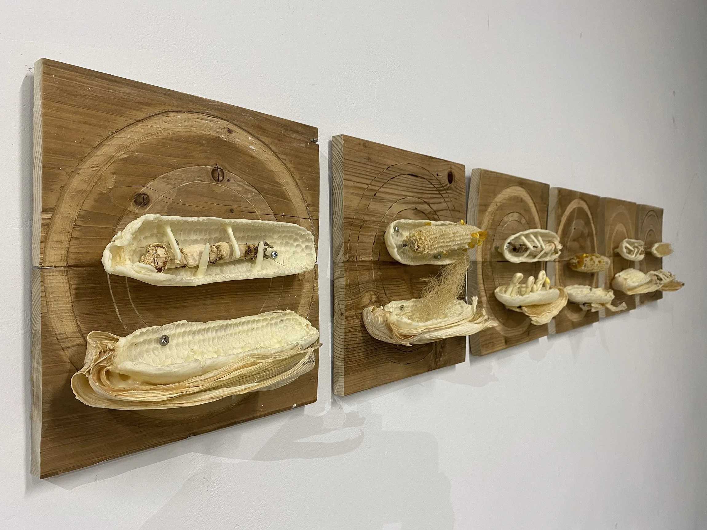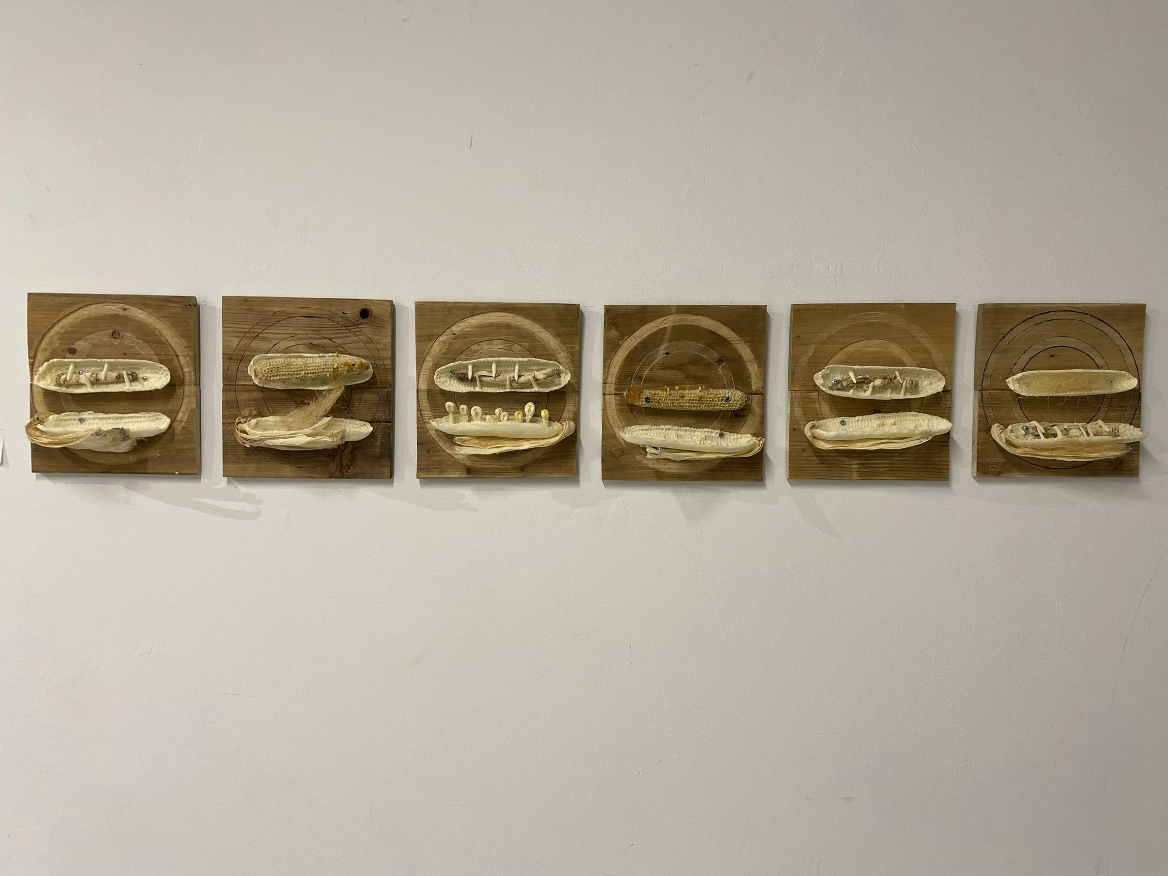 Reliquaries I, 2026. Found pine wood; stalk, silks, husk and cob of maize, cornflour and screws 35 x 150 cm.